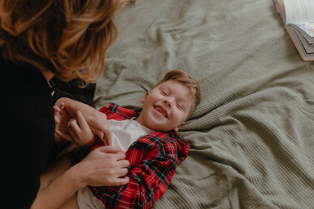 Warm bedroom moment showing laughing child wearing red plaid pajamas while mother tickles him, lively indoor interaction, playful family energy, soft light and comfortable home setting.