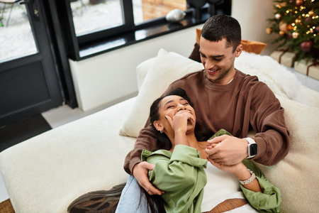 A loving couple shares joyful moments in their modern living room adorned for Christmas.