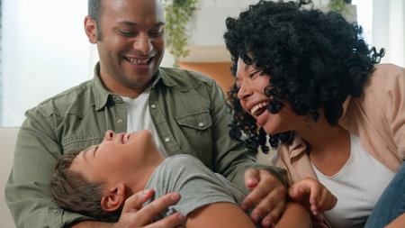 Happy multiracial family parents playing with cute little boy son tickling have fun laugh together funny game on home sofa playful African American mom dad embrace child kid affectionate relationship