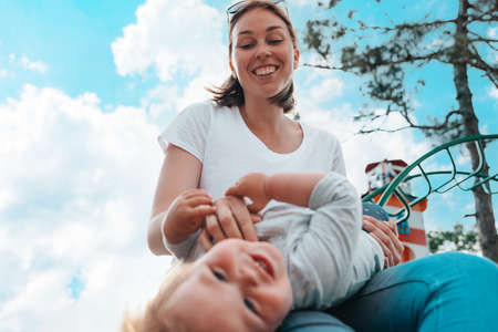 Young smiling Caucasian mother plays with a child, rolling it in her arms. Bottom view, close-up. Concept of children's education and autism.