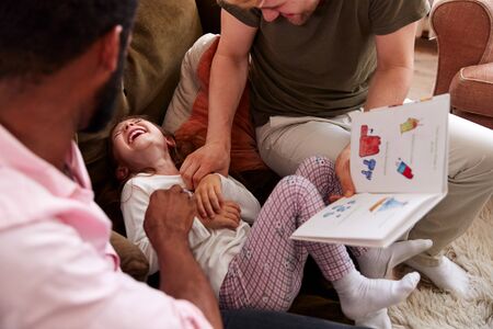 Same Sex Male Couple Reading Book With Daughter At Home Together Whilst Tickling Her