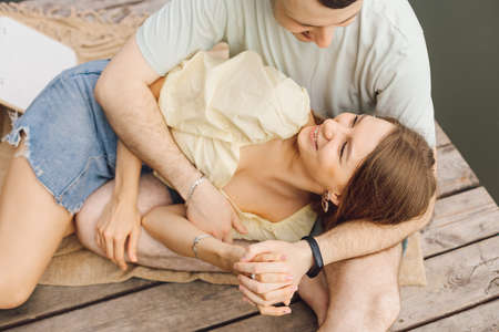 Romantic couple 's date in nature on summer day. Happiness and serenity. Rest and enjoyment. Wonderful moments of life. Super day. Romantic relationships. Lifestyles.