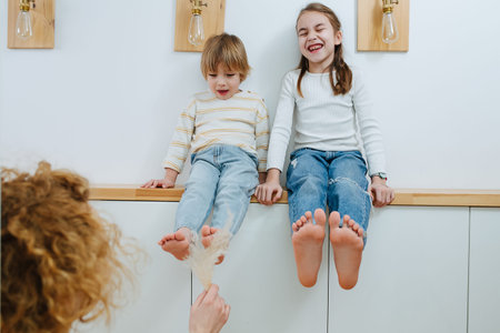 Mom tickling her children's feet with a fluffy cereal spikes. They are sitting on a shelf, a girl is laughing, a boy is slightly afraid.