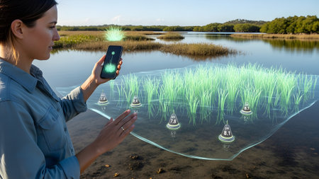 A woman holds a smartphone displaying a holographic interface over a wetland environment showing...