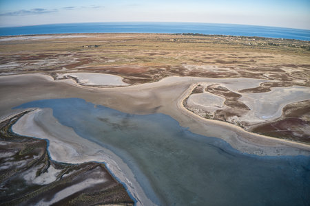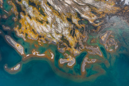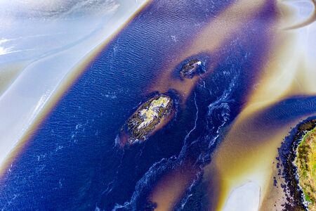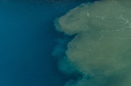 Top down aerial view over natural texture - abstract industrial lake water patterns. Turquoise waternature poluttion