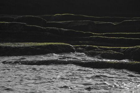 Sea tide on the moss-covered rocky beach, Bali, Indonesia.