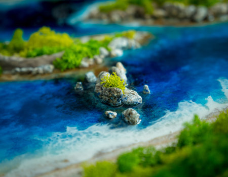 Dark rocks surrounded by swirling teal waves. Abstract ocean scenery.
