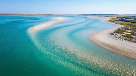 A serene view captures a winding river flowing into the clear turquoise sea. Soft white sands outline the beach, creating a perfect getaway.