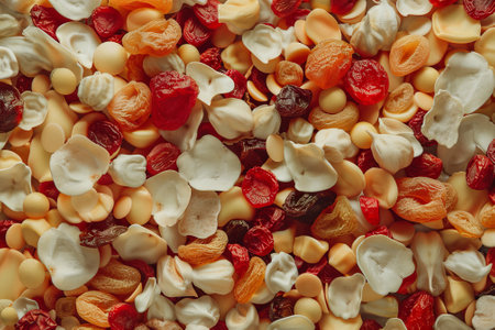 Top view of mixed dried cranberries, apricots, and nuts creating a colorful texture. Generative AI
