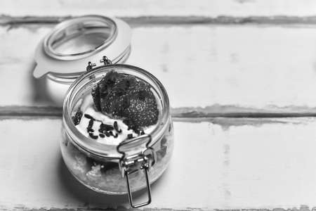 Strawberry cheesecake dessert in a jar on the table black and white poster