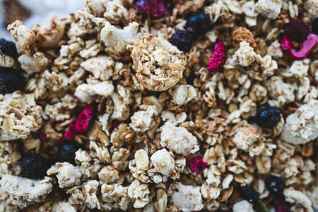 vegan homemade granola with oats grains and dried fruits in glass lunch box, healthy plant-based food recipes