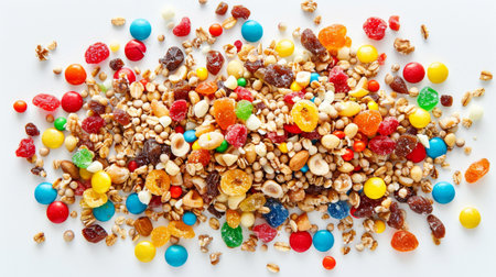 Colorful candy crafted from a mixture of nuts and dried fruits, presented in a top view composition against an isolated white background