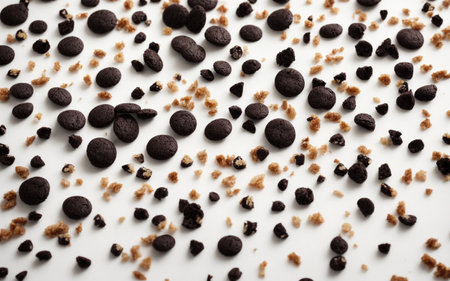 The shape of a circle lined with crumbs from cookies on white background. Copy space.