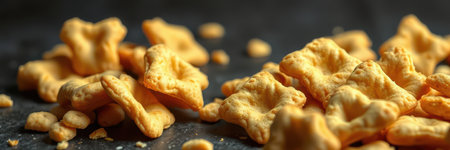 Crunchy snack pieces scattered on a dark surface with a few pieces overlapping and scattered crumbs nearby