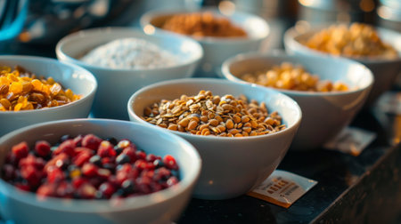 An assortment of nutritious nuts, seeds, and grains in ceramic bowls, captured in warm lighting. Perfect for healthy eating, culinary, and organic food concepts.