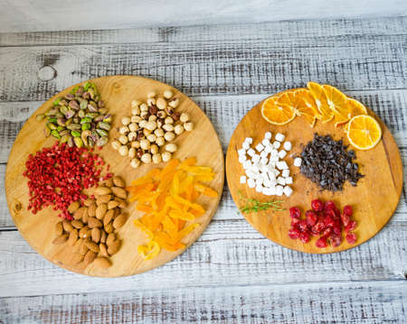 Assorted nuts and candied fruits on a wooden background. Healthy food. Vegan.