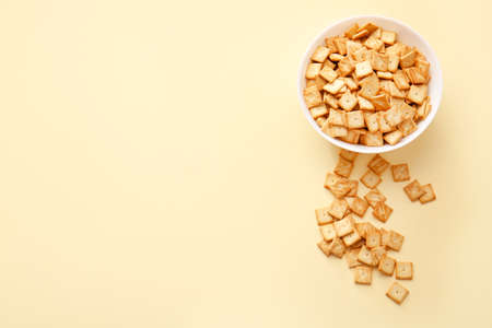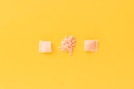 A clean, minimalistic shot of caramel-flavored crisps arranged in a casual pattern on a white surface with ample space for branding
