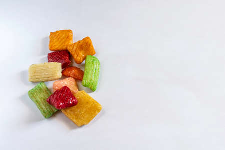 A bunch of Japan mix sweet in white backgound, Selective focus, Selective focus on subject, background blur