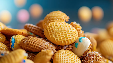 Crunchy and soft cookies mixed with wafers on a tray, vibrant and playful in composition