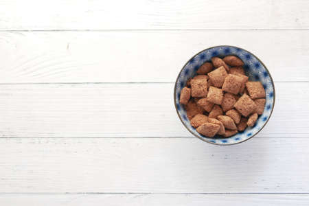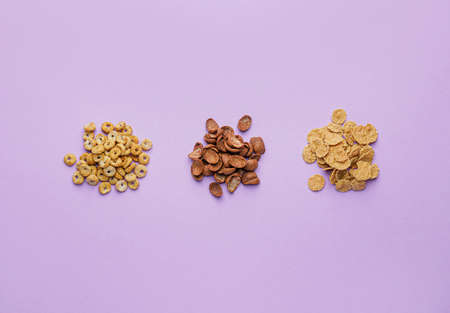 Dry breakfast in glass round plate bowl view from above Macro photo of delicious cornflakes drenched in milk. Useful healthy breakfast. food for kids. Different types of cereals, multicolored balls flatly