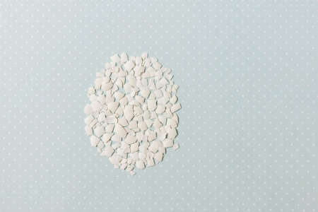 Pieces of white shell chicken egg, folded in the shape of an egg on a blue background, easter pattern.