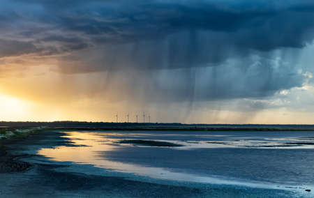 Sandy shore near the cliff of Cap Blanc Nez on the coast of France at the Straight of Dover (Pas de Calais) at sunset. Dramatic evening sky, epic colorful clouds after the storm. Travel, ecology theme