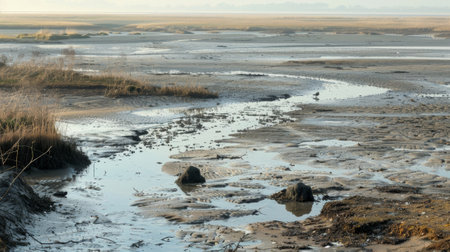Broad back barrier marsh at low tide silt textures from above wallpaper background representing coastal wetland pattern suitable for calm natural design