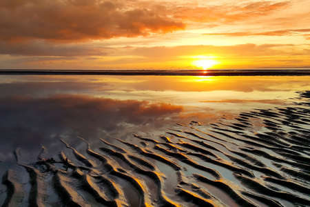 A beautiful sunset over a beach at low tide creates intricate patterns in the wet sand. The setting sun casts a warm, golden glow that reflects on the water in the sand ripples, creating a serene and textured landscape.