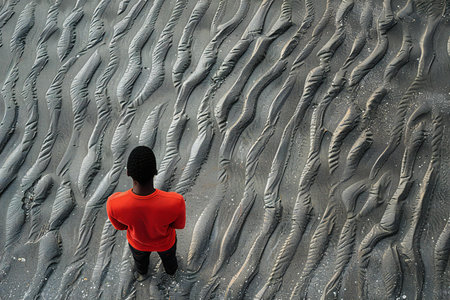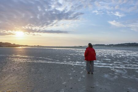 Lonely man standing on the sand of a beach in Brittany at ebb evening mood peaceful feeling