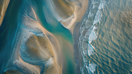 Serene showing winding river on a sandy beach at sunset with warm golden light keywords: river, beach, sand, water, ocean, sea, coastline, shore,...