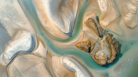 Aerial view of intricate sand ripples and channels formed by the receding tide on a beach, showcasing natural patterns of water and sand.