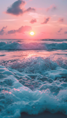 Experience the beauty of gentle ocean waves lapping at the shoreline at sunset, creating a tranquil and serene ambiance perfect for relaxation and escape.
