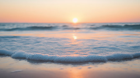 Serene beach sunrise with gentle ocean waves, calming seascape. Nature tranquility and relaxation concept