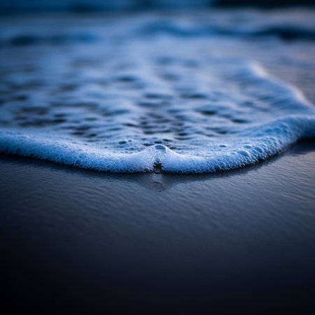 A serene beach scene at sunset, with a gentle wave washing over the sand, creating a delicate pattern of foam. The warm light of the setting sun casts a golden glow on the wet sand, highlighting the intricate details of the wave's edge.