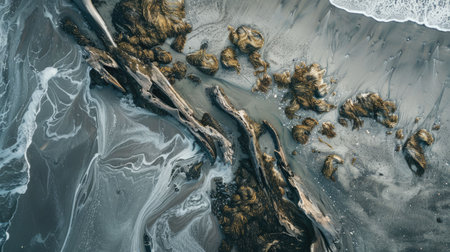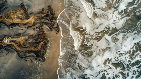 This aerial image captures the vibrant interaction between ocean waves and the sandy shoreline, showcasing the beauty of aquatic environments and natural textures.
