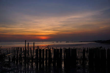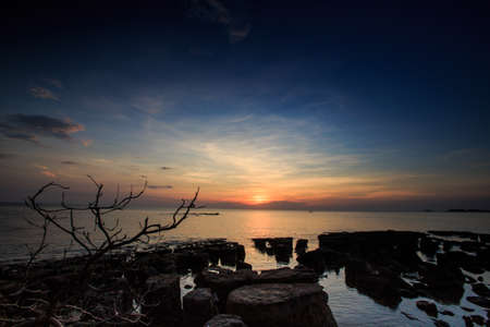 Landscape of Sunset at Chonburi coast in early winter.One mangrove tree and stone was hit by waves. The restaurant was built way to the sea and there is a pavilion for sunset views.