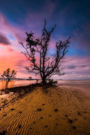 Dead trees in the sea at an eroded coastal line at kelanang beach malaysia at sunset
