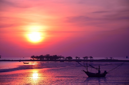 Silhouette fishingboat in sunset with tropical beach on background Thailand.