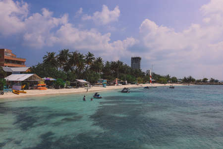 Maafushi, Maldives - June 25, 2021: People near the White Sandy Beach with the Palm Trees and Hotel Building on the Maldivian Paradise Island