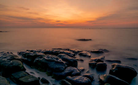 Rocks on stone beach at sunset. Beautiful landscape of calm sea. Tropical sea at dusk. Dramatic golden sunset sky and clouds. Beauty in nature. Tranquil and peaceful concept. Clean beach in Thailand.