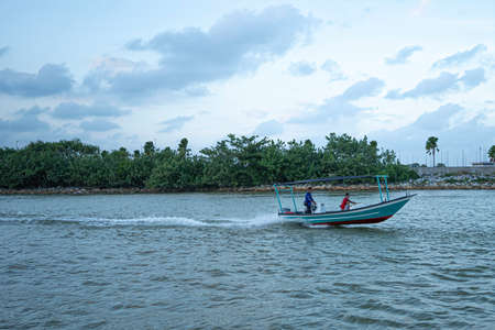 Terengganu, Malaysia: Jan 17, 2022 - Small speedboat moving along the river in the east coast state of Malaysia.
