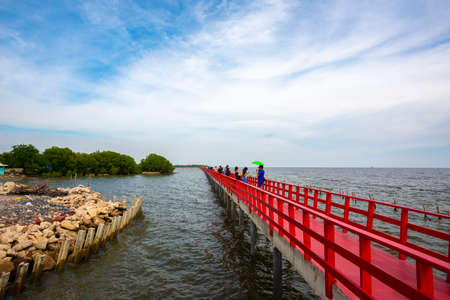Samut Sakhon, Thailand - October 23 ,2020 : People walking on the wooden Red Boardwalk bridge viewpoint of sea in Mueang Samut Sakhon District, Thailand