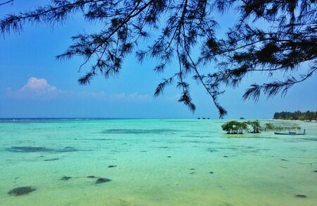 Sunset dramatic sky on tropical desert beach, coral reef reflection no people, travel destination, Indonesia Wakatobi