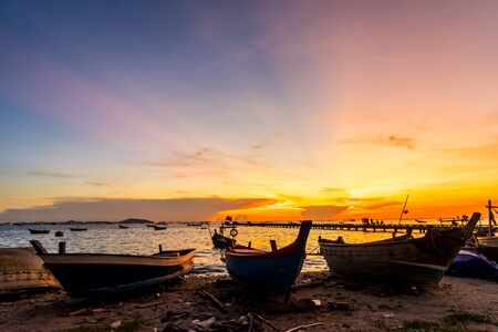 Silhouette Small fishing boat at shore in sunset at Bang Phra Beach,sriracha choburi,thailand