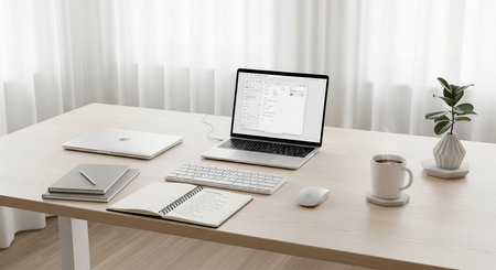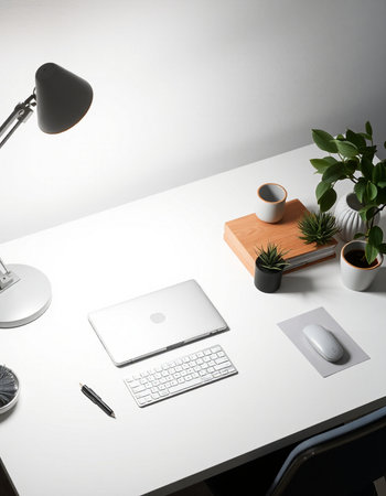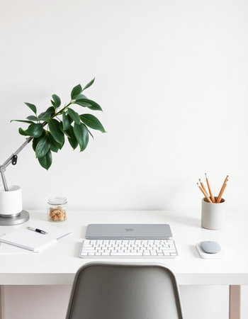 A laptop computer sits open on a bright white desk, accompanied by a keyboard, mouse, and a small potted plant. The setting is clean and minimalist, with neutral colors and soft lighting. This image could be used for various purposes, including website design, advertising, and marketing materials.
