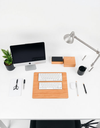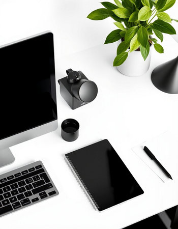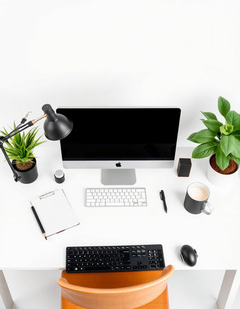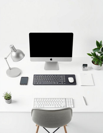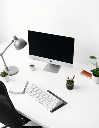 Modern white office desk with computer, supplies and plant.