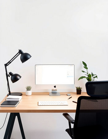 Office desk with computer, lamp and plant on the white wall background