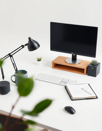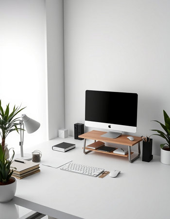 Modern workspace with blank screen computer on white desk. 3d render