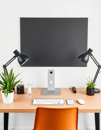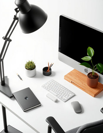 Modern workplace with computer, lamp and other items.