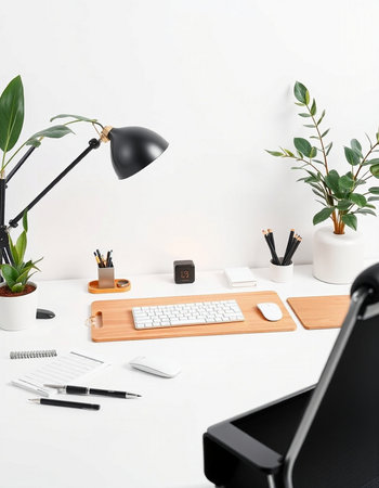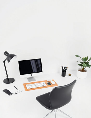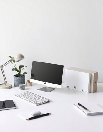Minimalist workspace with computer, stationery and plants on white wall background